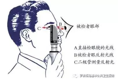 检查应在暗室环境中进行;若检查者本人戴有眼睛,需取下眼镜检查;对年纪较大或需要详细检查眼底的患者,条件允许时检查前最好散瞳(排除散瞳禁忌证)。检查右眼时,右手持镜,站于患者右手边,用右眼观察,同法检查左眼。