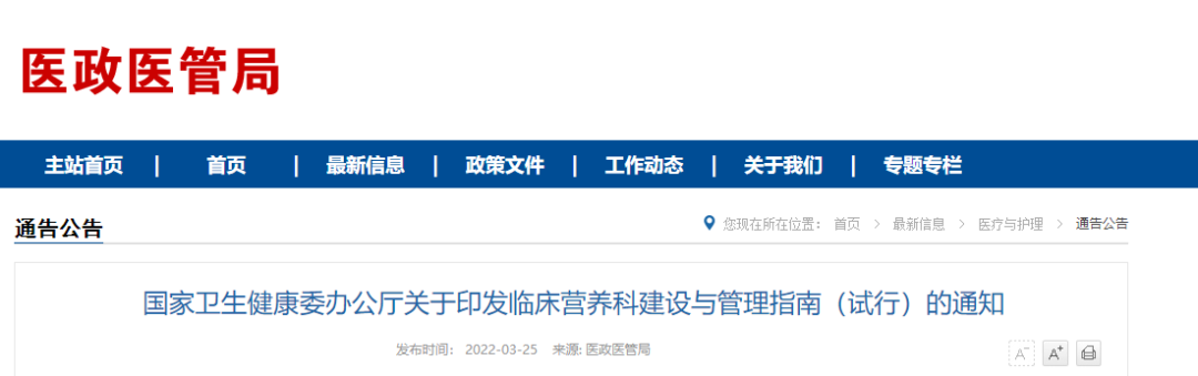 今年3月,国家卫生健康委为指导和规范医疗机构临床营养科建设与管理,组织起草了《临床营养科建设与管理指南(试行)》,指南要求:所有二级以上综合医院以及肿瘤、儿童、精神等专科医院,全部新增一个科室——临床营养科。
